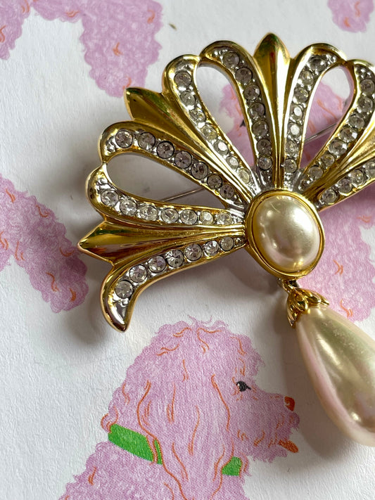 Vintage goudkleurige faux parel waaier broche