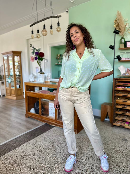 Niet beschikbaarVintage pastelgroene polkadot blouse. M-L