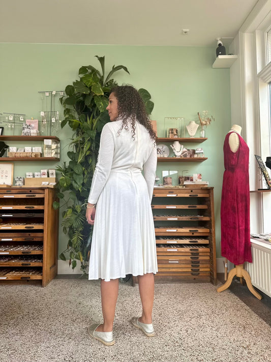 Vintage jurken hoeven absoluut geen “soepjurken” te zijn. Ik let bij het inkopen goed op de pasvorm en het silhouet. Veel vintage jurken zijn ontworpen om het lichaam mooi te volgen: denk aan taillering, plooien, A-lijn modellen of subtiele schouderaccenten. Van een zwierige jurk die elegant met je meebeweegt tot een nauwsluitende vintage pencil dress die je curves benadrukt.