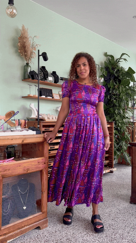 Vintage jurken hoeven absoluut geen “soepjurken” te zijn. Ik let bij het inkopen goed op de pasvorm en het silhouet. Veel vintage jurken zijn ontworpen om het lichaam mooi te volgen: denk aan taillering, plooien, A-lijn modellen of subtiele schouderaccenten. Van een zwierige jurk die elegant met je meebeweegt tot een nauwsluitende vintage pencil dress die je curves benadrukt.