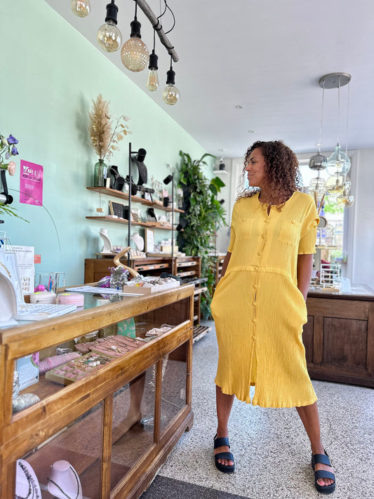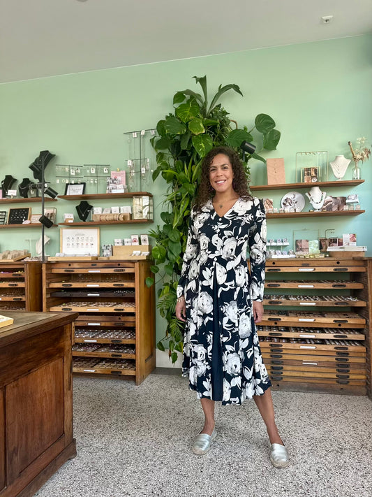 De vraag naar plus size vintage jurken groeit — en terecht. Bij het inkopen let ik goed op pasvorm én maat. Niet elke jurk is beschikbaar in grotere maten, maar ik doe altijd mijn best om een zo inclusief mogelijke collectie aan te bieden. Wel blijf ik streng: kleur, print en pasvorm moeten kloppen. Ook in grotere maten wil je je gewoon mooi voelen.