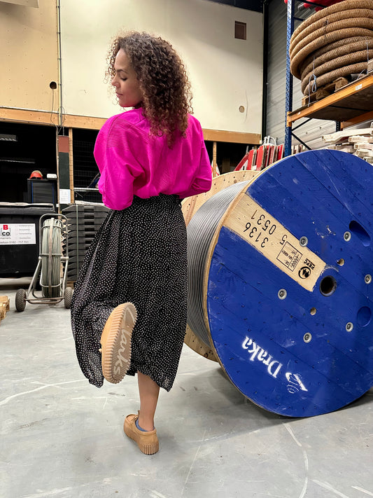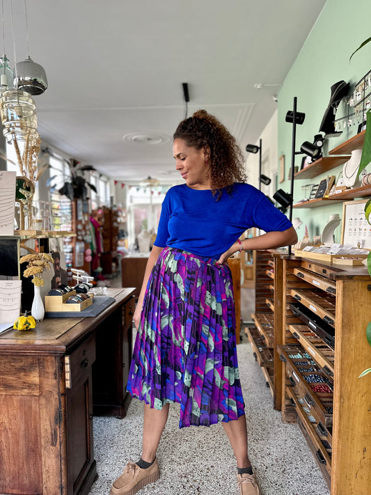 De vintage plooirokken in mijn collectie komen vaak uit de jaren 70 en 80. Ze zitten heerlijk door de elastische tailleband en vallen in een flatterende A-lijn. Door de stevige plooien krijgen ze die typische zwier — ideaal voor zowel casual als zakelijke looks.