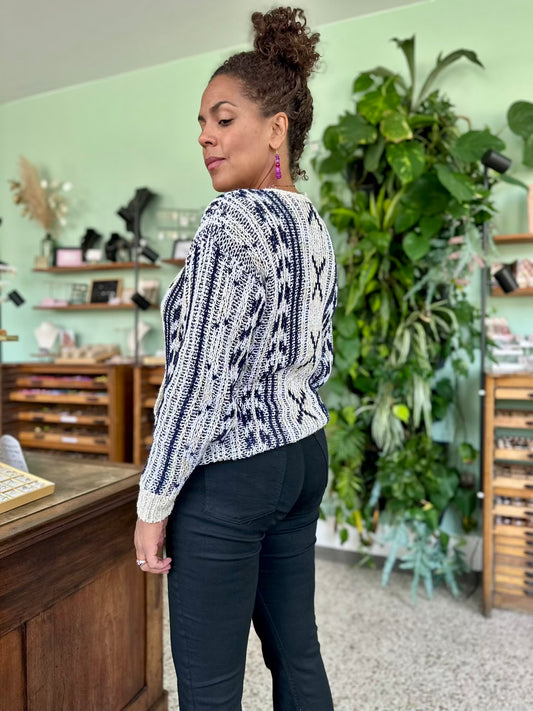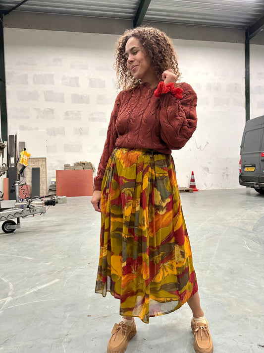 Veel van de truien in mijn collectie zijn gebreide vintage truien, met liefde gemaakt en soms zelfs met de hand gebreid. De structuur van zo’n trui — denk aan een kabelpatroon, ribbelsteek of juist een grafisch zigzagmotief — geeft direct karakter aan je outfit. Geen enkele trui is hetzelfde, en dat maakt ze zó bijzonder.