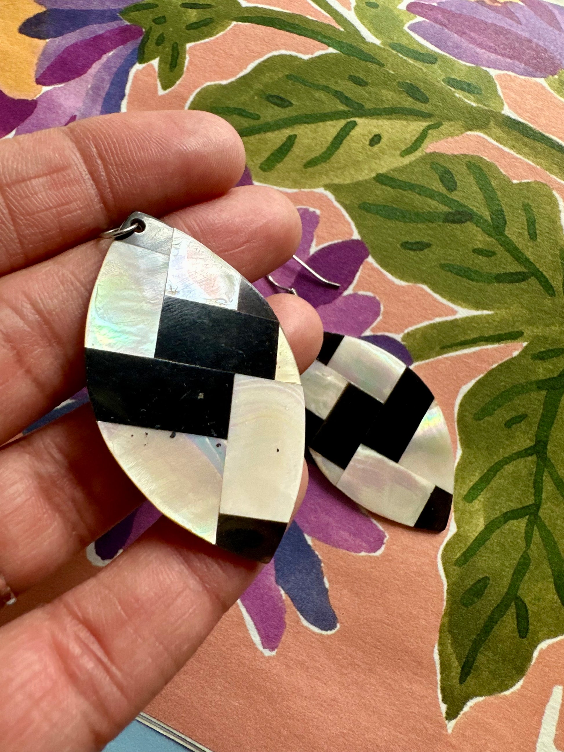 Grote ovaalvormige oorbellen gemaakt van schelpen. Ingelegd in visgraatpatroon, afgewisseld met zwarte vakken. Een lust voor het ook en van zware kwaliteit.