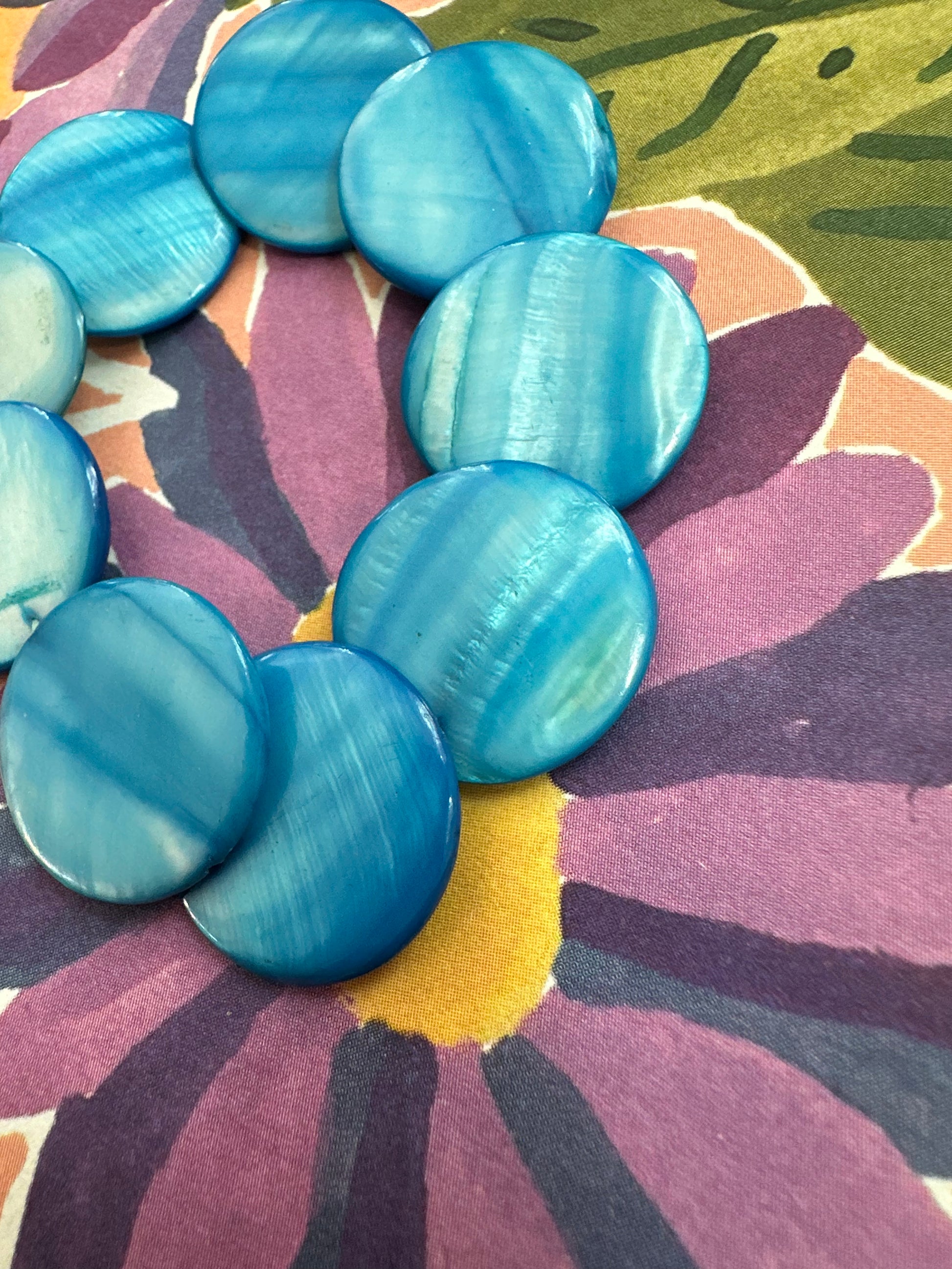 Knalblauwe armband gemaakt van schelpen. Met een subtiele parelmoer glans. De schelpen blijven met een elastieken band bij een.
