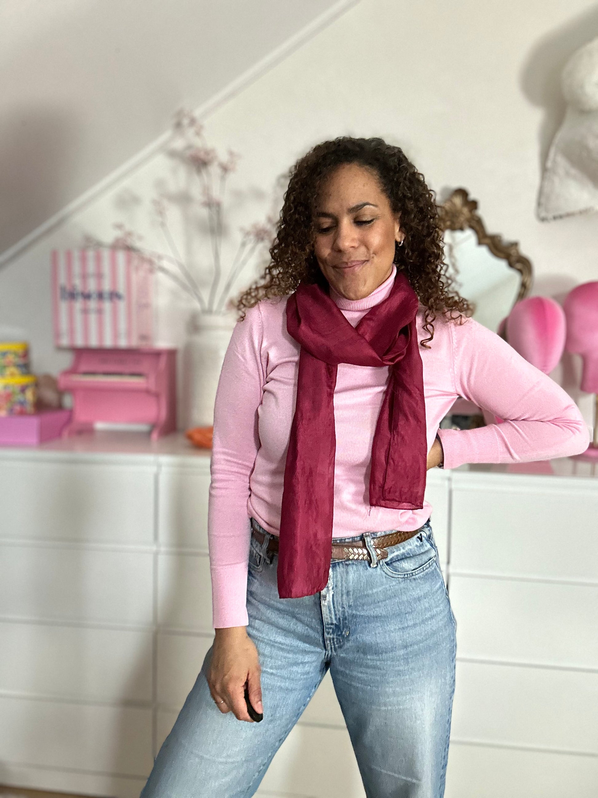 Elegant rechthoekig sjaaltje gemaakt van zijde. Als je het sjaaltje in het licht houdt, zie je een breed strepenpatroon. Door de afmetingen ook goed als sjaaltje voor in je haar te dragen.