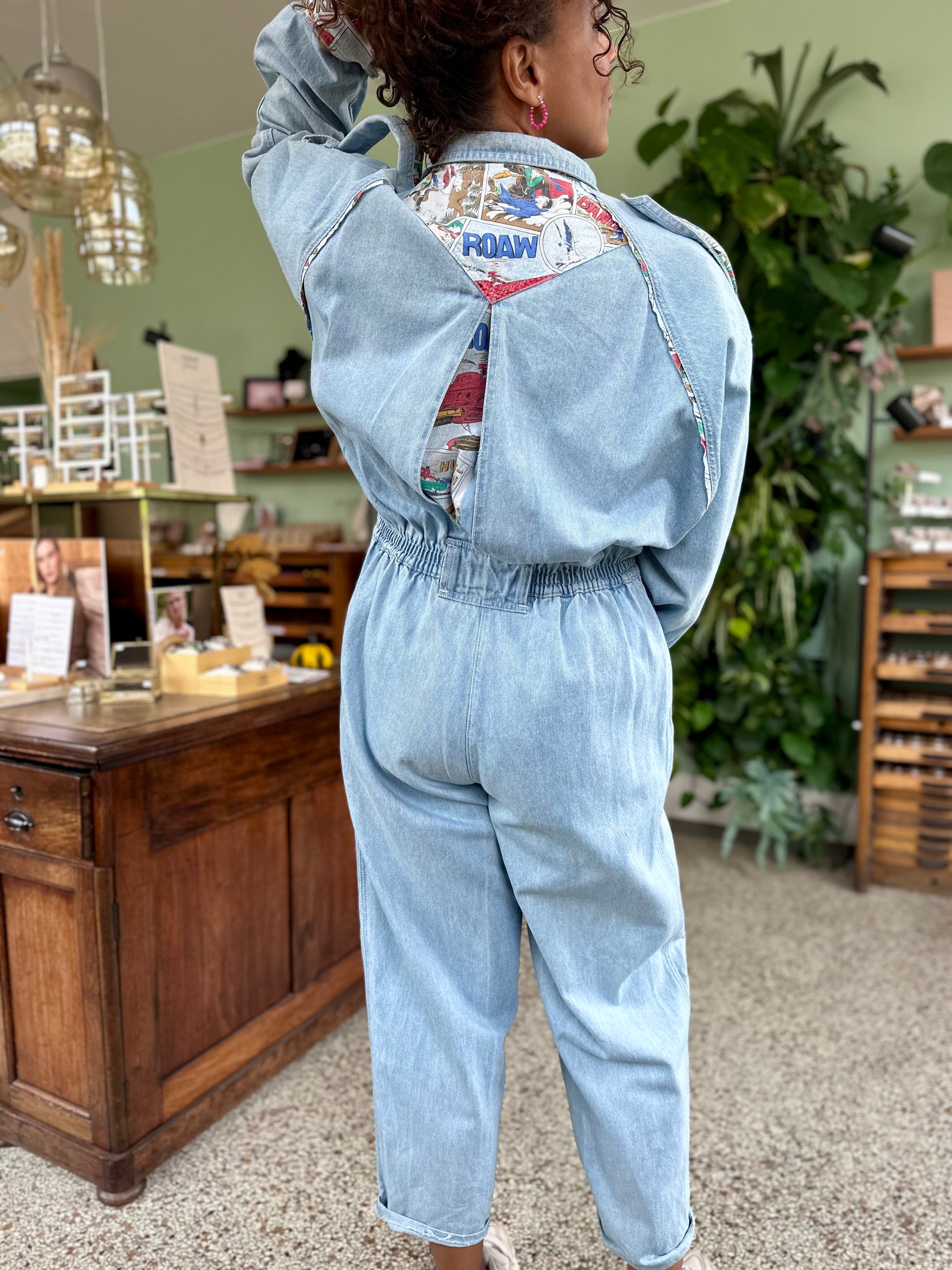 Comic-star alert! Deze raw denim jumpsuit met comic print is een echte eyecatcher én gaat een leven lang mee.
