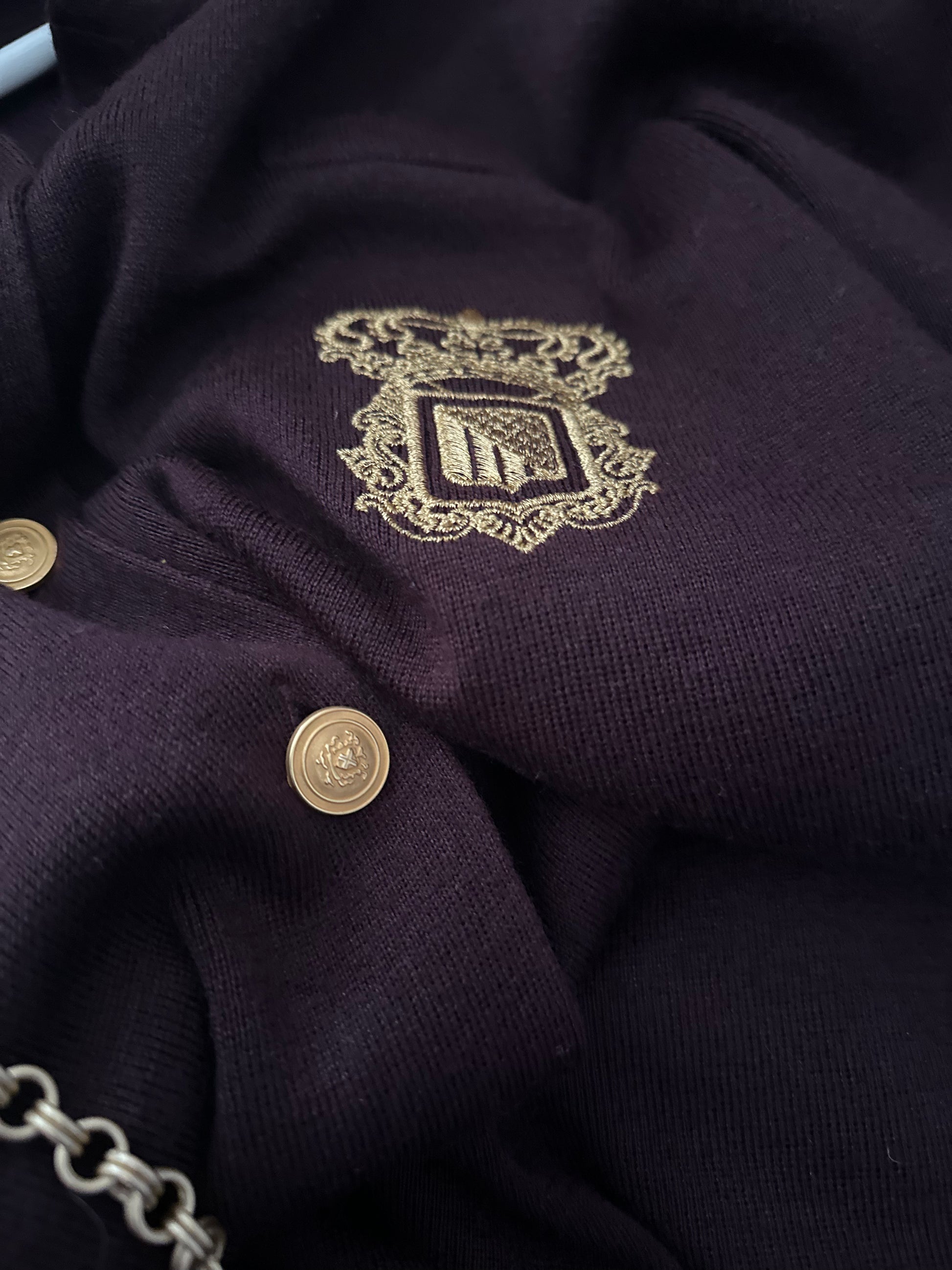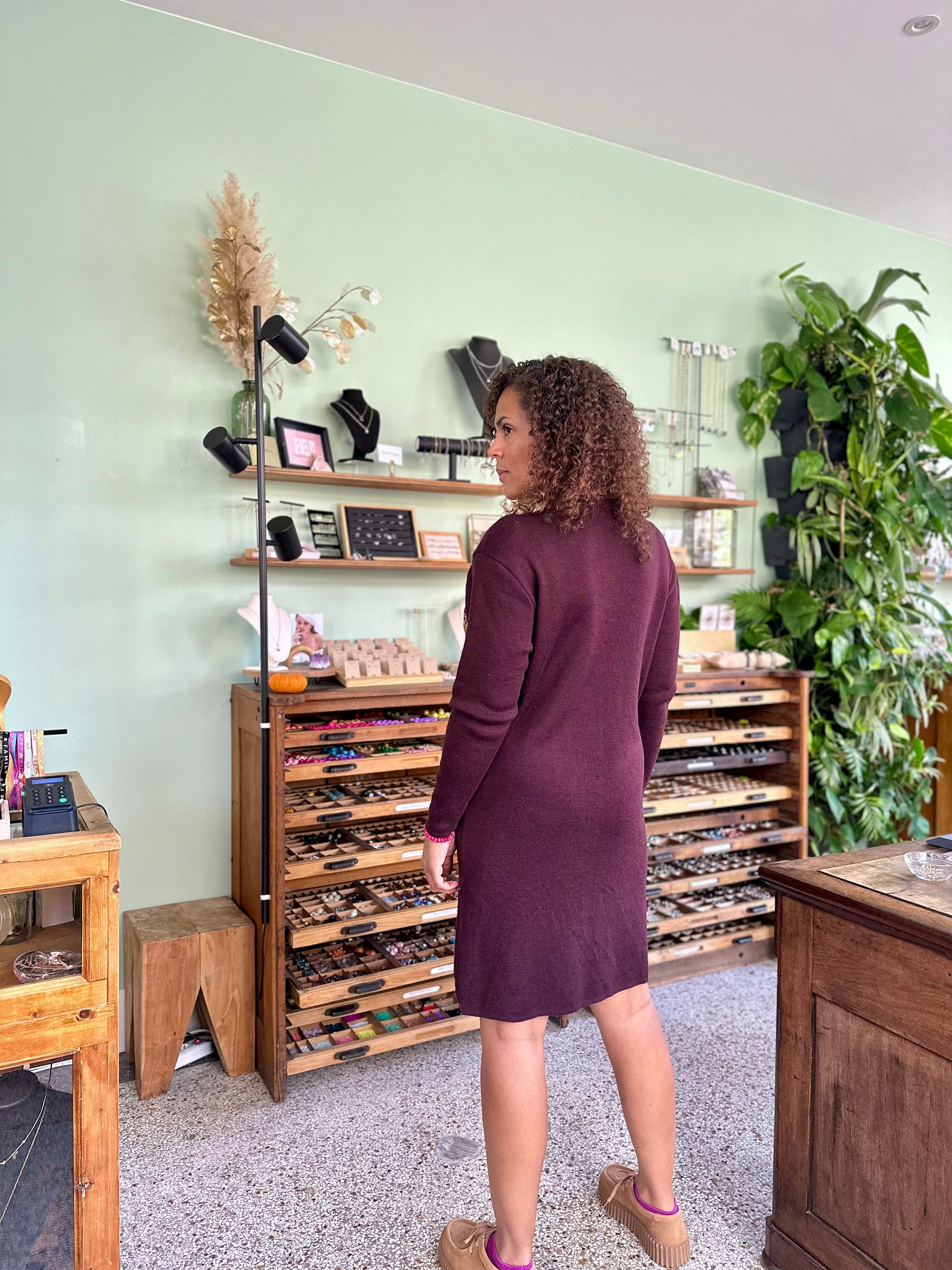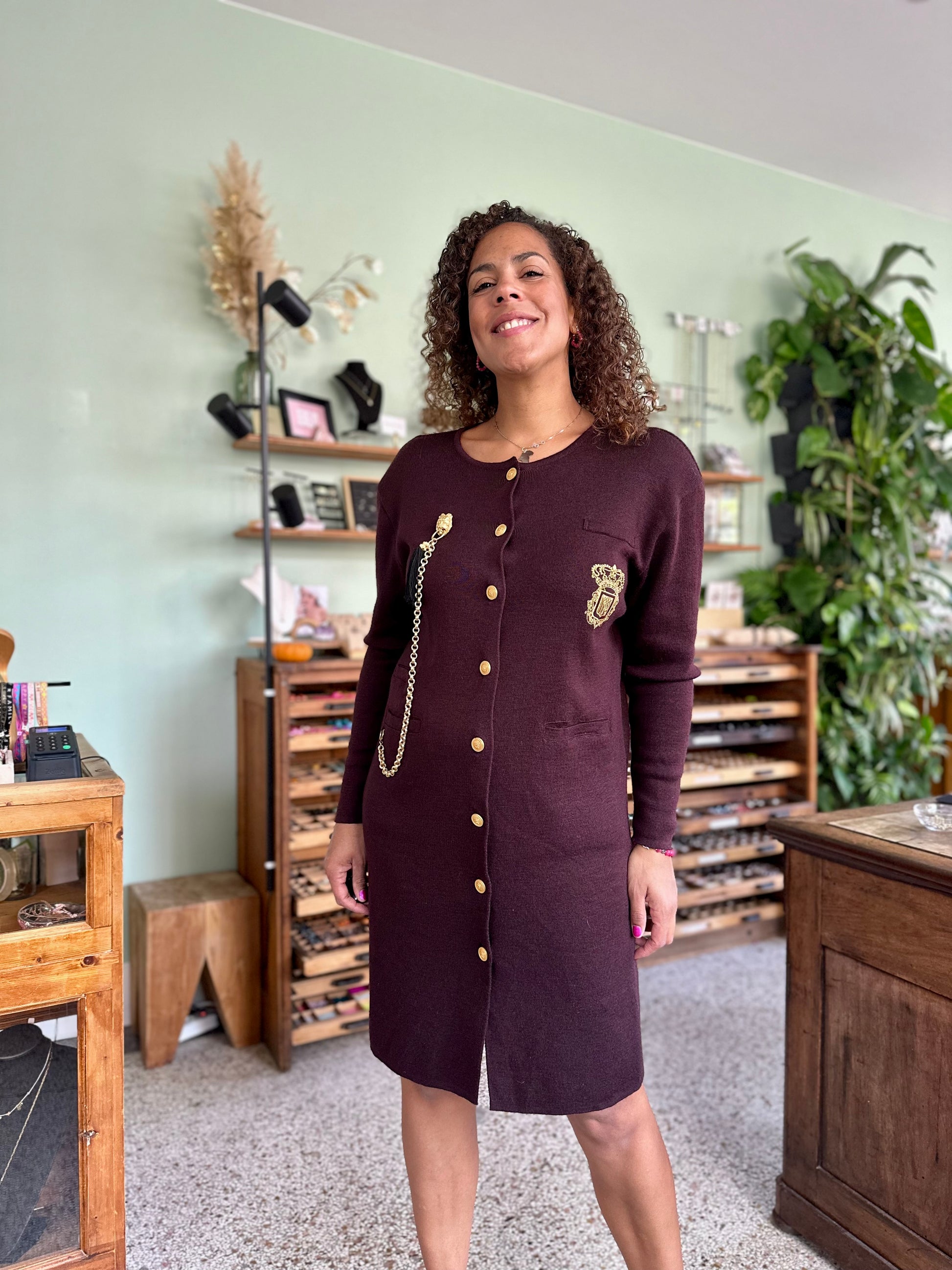 Fijngebreid jurkje in een heel donker aubergine tint. Het jurkje is heerlijk zacht en warm, maar heeft ontzettend stoere details. Gouden knoopjes, een goudkleurig borduurwerk in d e vorm van een vaandel en een heuse broche met leeuwenkop behoort tot de uitrusting. Een prachtig en uniek exemplaar, waarmee je direct in stijl de herfst. in wandelt.