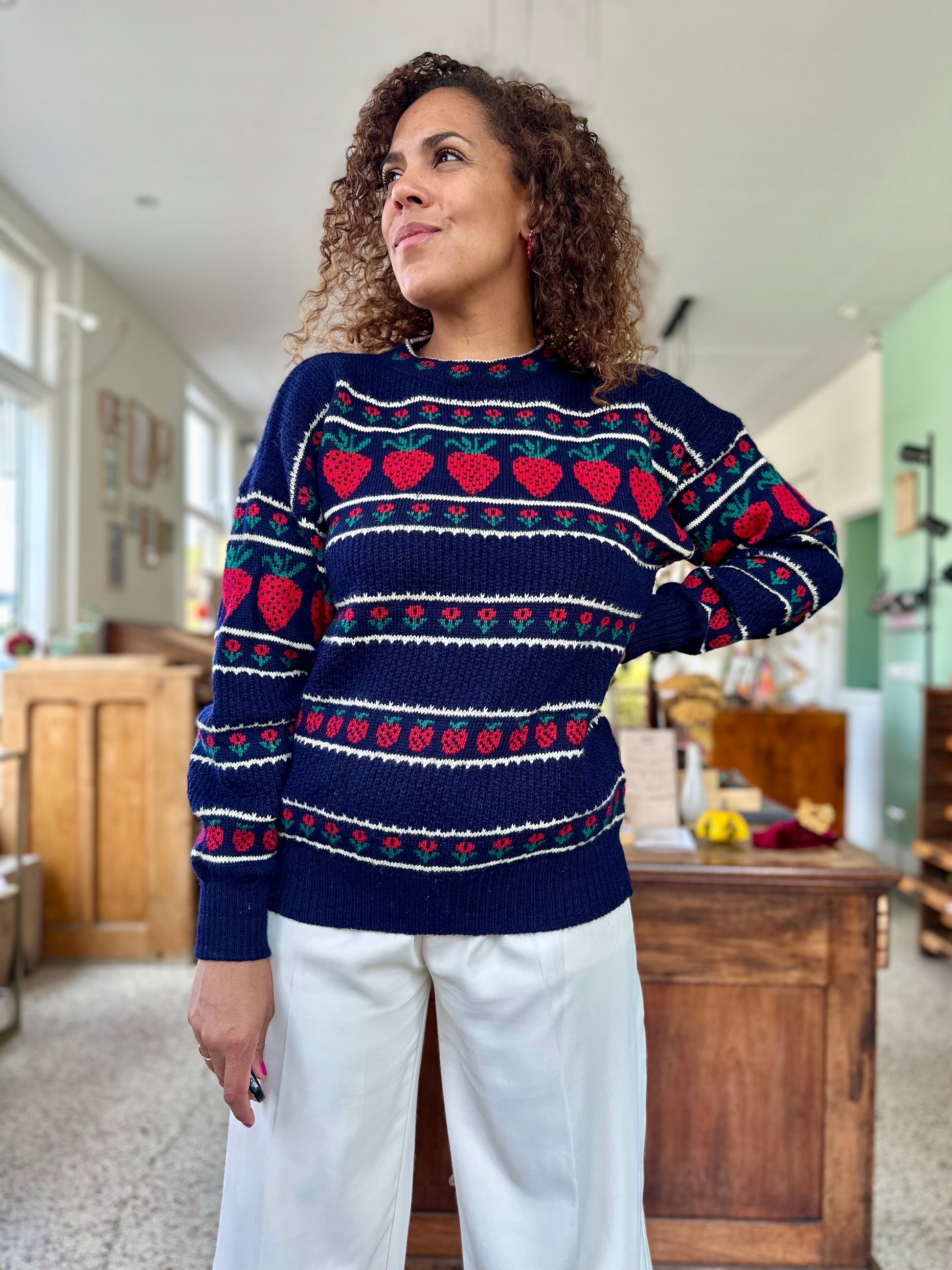 Vintage gebreide wollen sweater met aardbeiden en frambozen