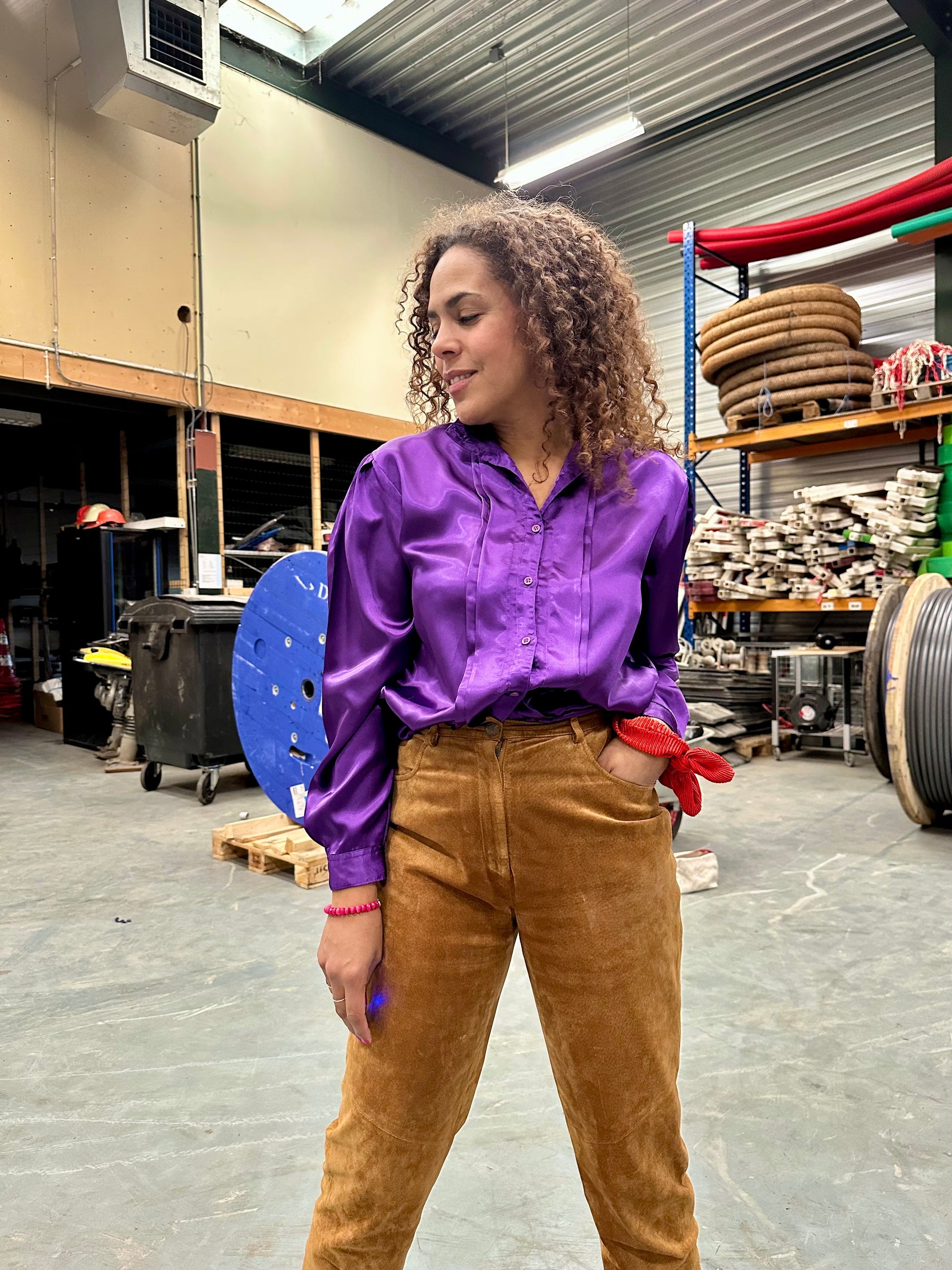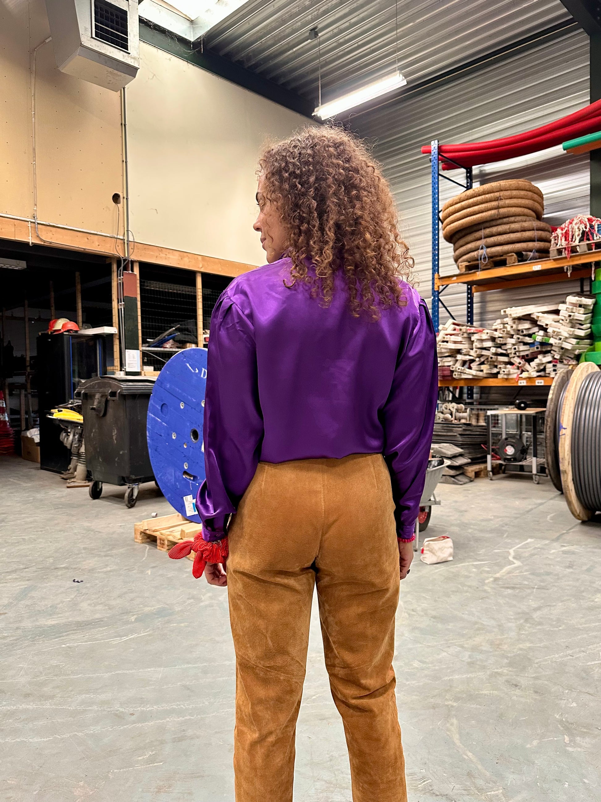De combinatie van de rijke paarstint & de subtiele glanzende stof geeft deze blouse een echte luxe uitstraling. Staat geweldig op een jeans maar ook fantastisch op een pantalon. En stiekem ook met een knipoog naar de decembermaand, want deze schoonheid doet het heel goed op feestjes.