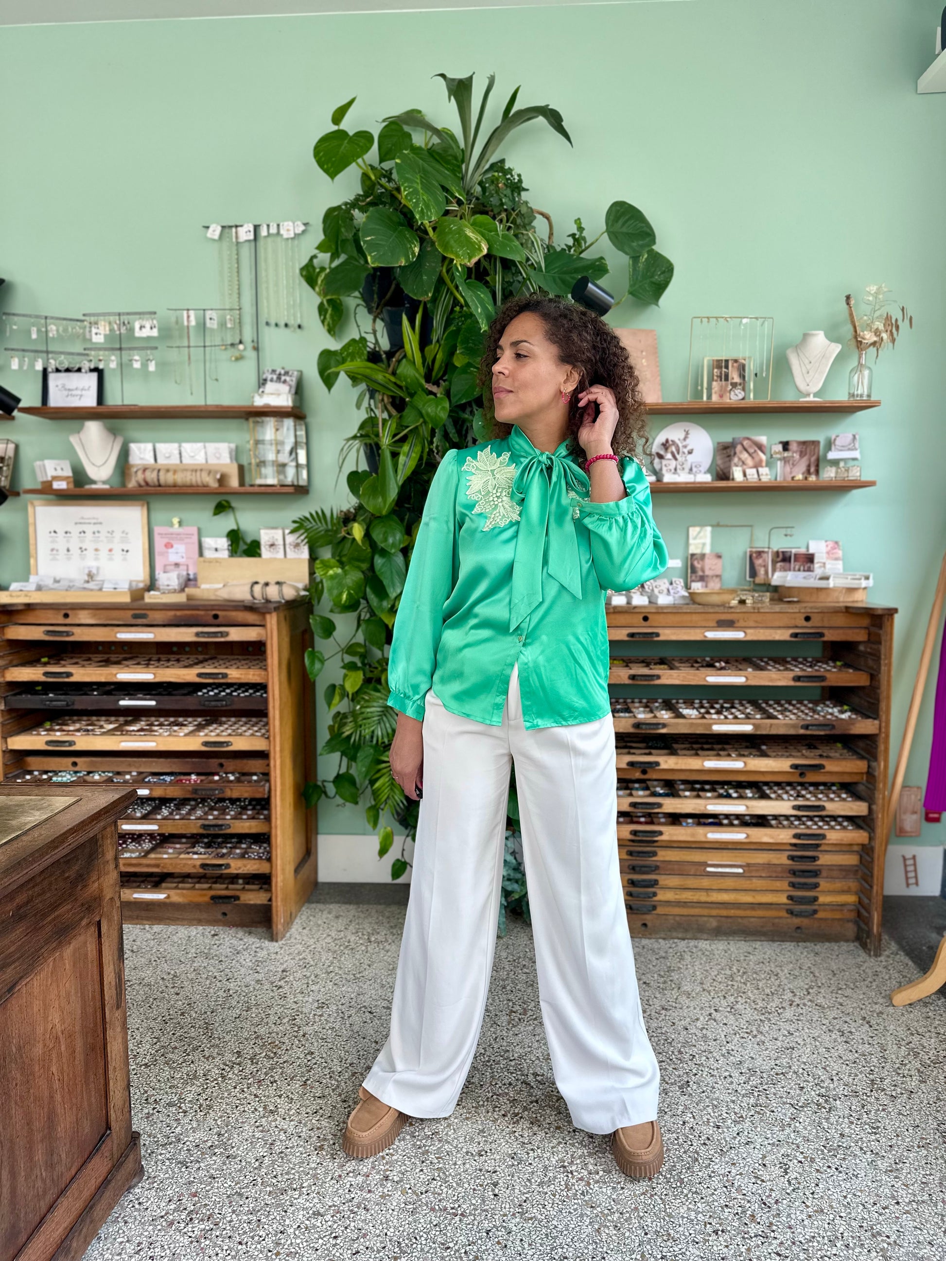 Prachtig sierlijke blouse in een helder groene kleur. Als kers op de taart heeft de blouse een striksluiting en mooie borduursels (als patches) op de borst verwerkt. De blouse is van een mooie zachte, glanzende kwaliteit, war zorgt voor een rijke en luxe look-and-feel.
