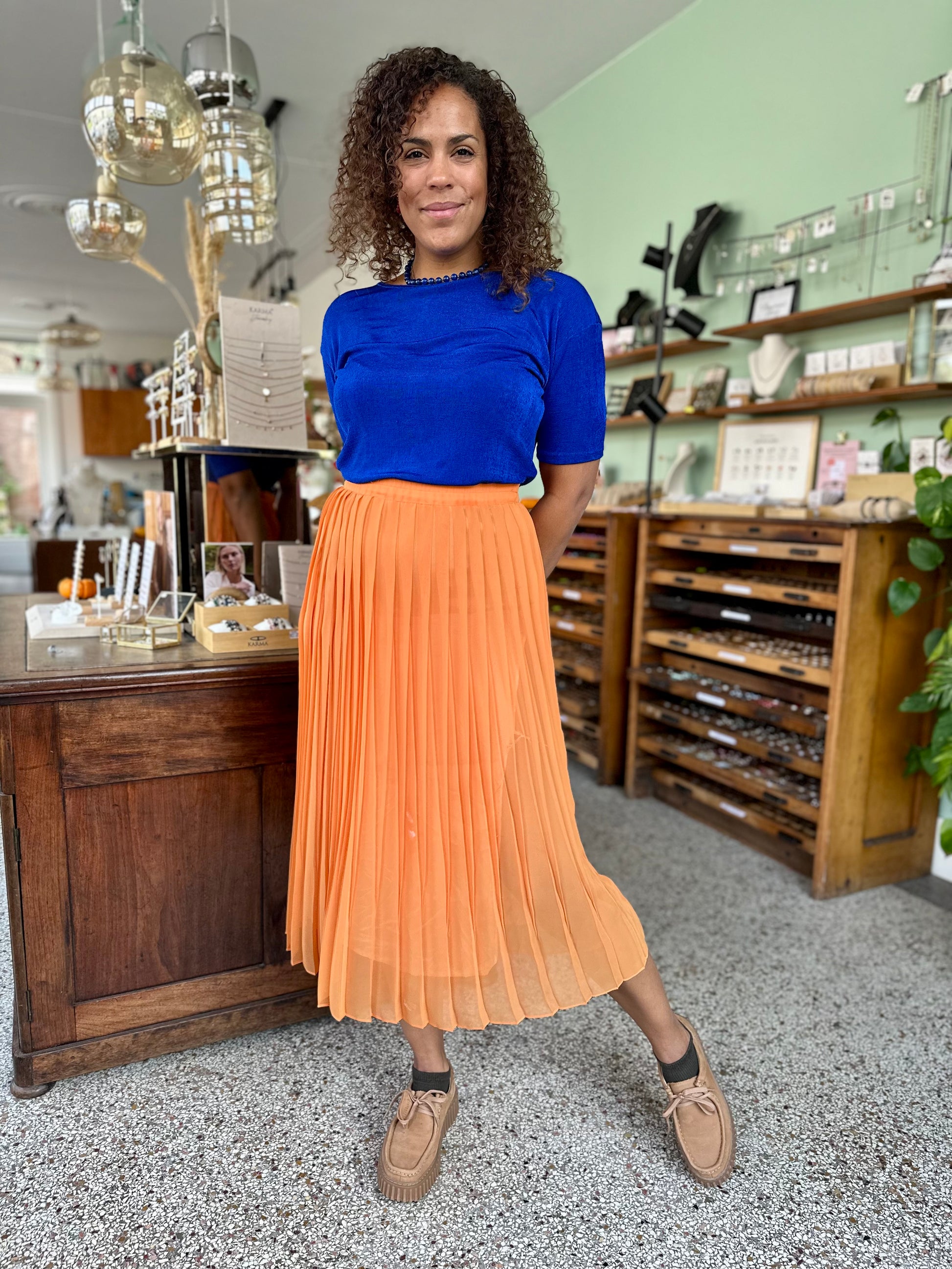 Intens mooie diep blauwe top die ontzettend lekker zit maar bovenal: geweldig staat! Door het elastaan in de top rekt deze lekker mee, en door de subtiele glans maakt deze top elke outfit tot een klein feestje. Combineert verrassend goed bij vele andere kleuren, een fijne basic dus.
