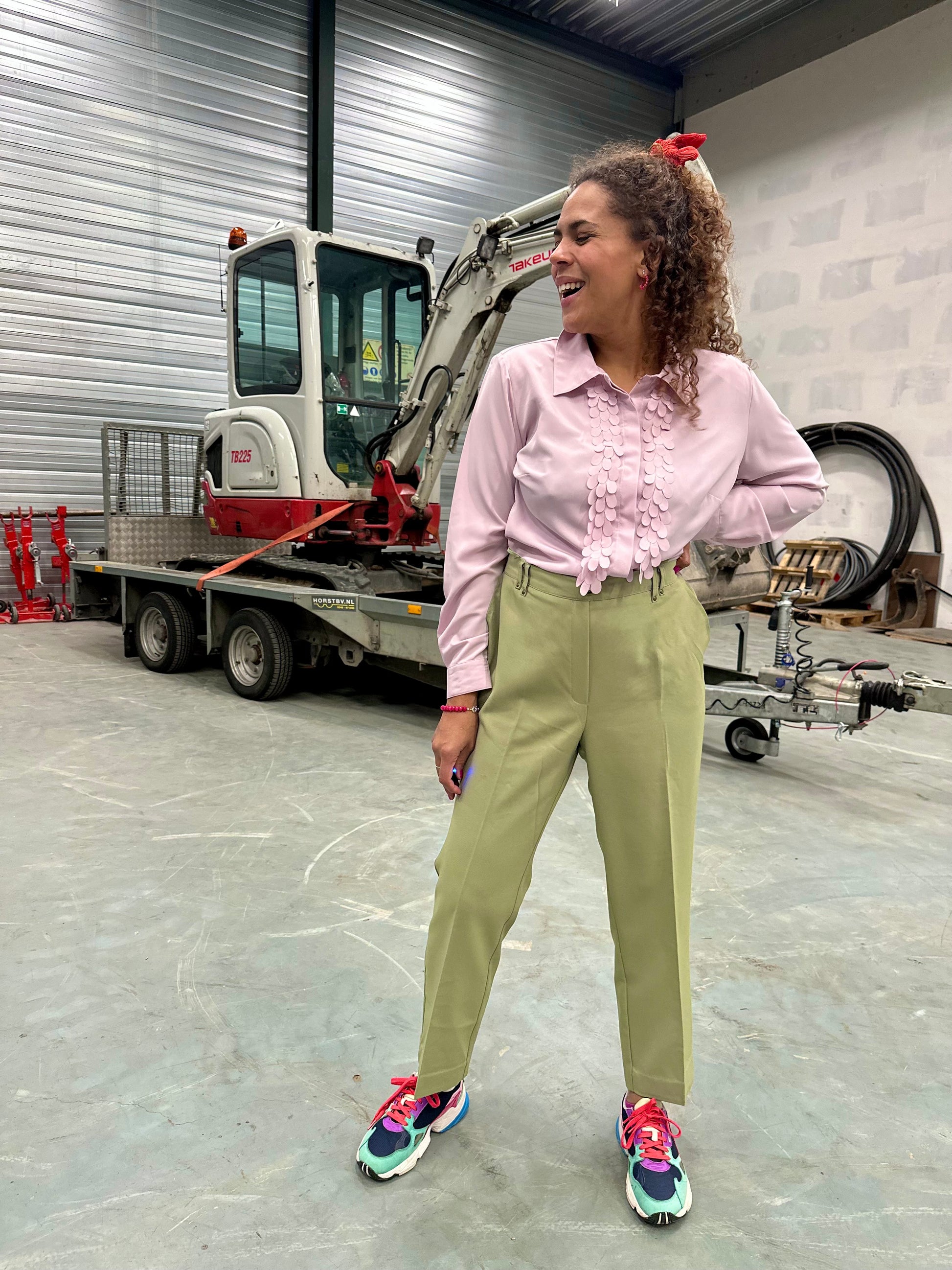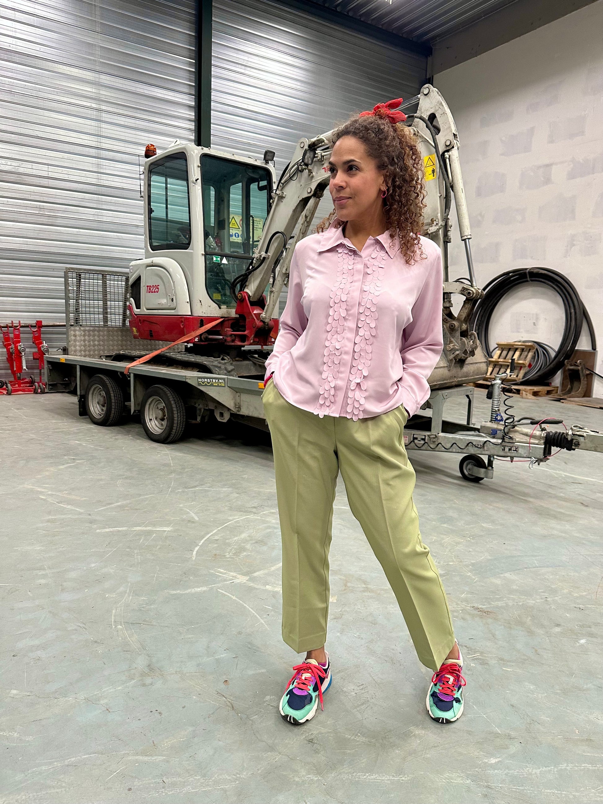 Fantastische lila/zachtroze blouse met twee rijen met tientallen losse 'blaadjes' die een ontzettend romantisch effect aan de blouse geven. Pure klasse, en net even anders dan je every-day blouses.