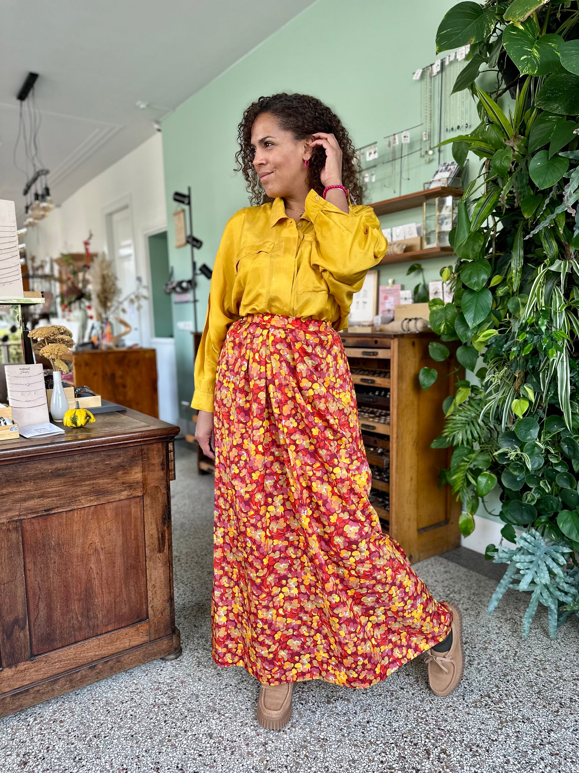 Deze fantastische rok met kleurrijke bloemenprint is een echte mood booster. Het lichte materiaal beweegt luchtig mee, waardoor je outfit meteen speels en vrouwelijk oogt. Perfect voor dagen waarop je iets bijzonders wilt dragen, zonder moeite te doen. Wist je dat vintage maxi-rokken moeilijk te vinden zijn?