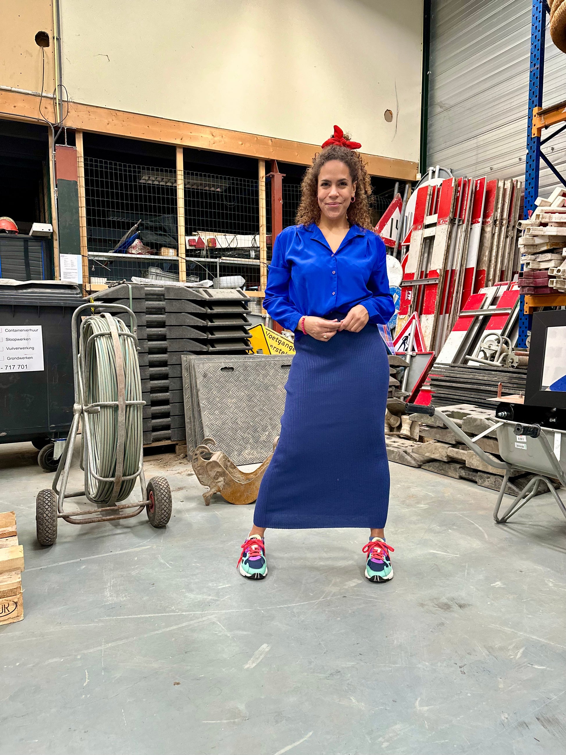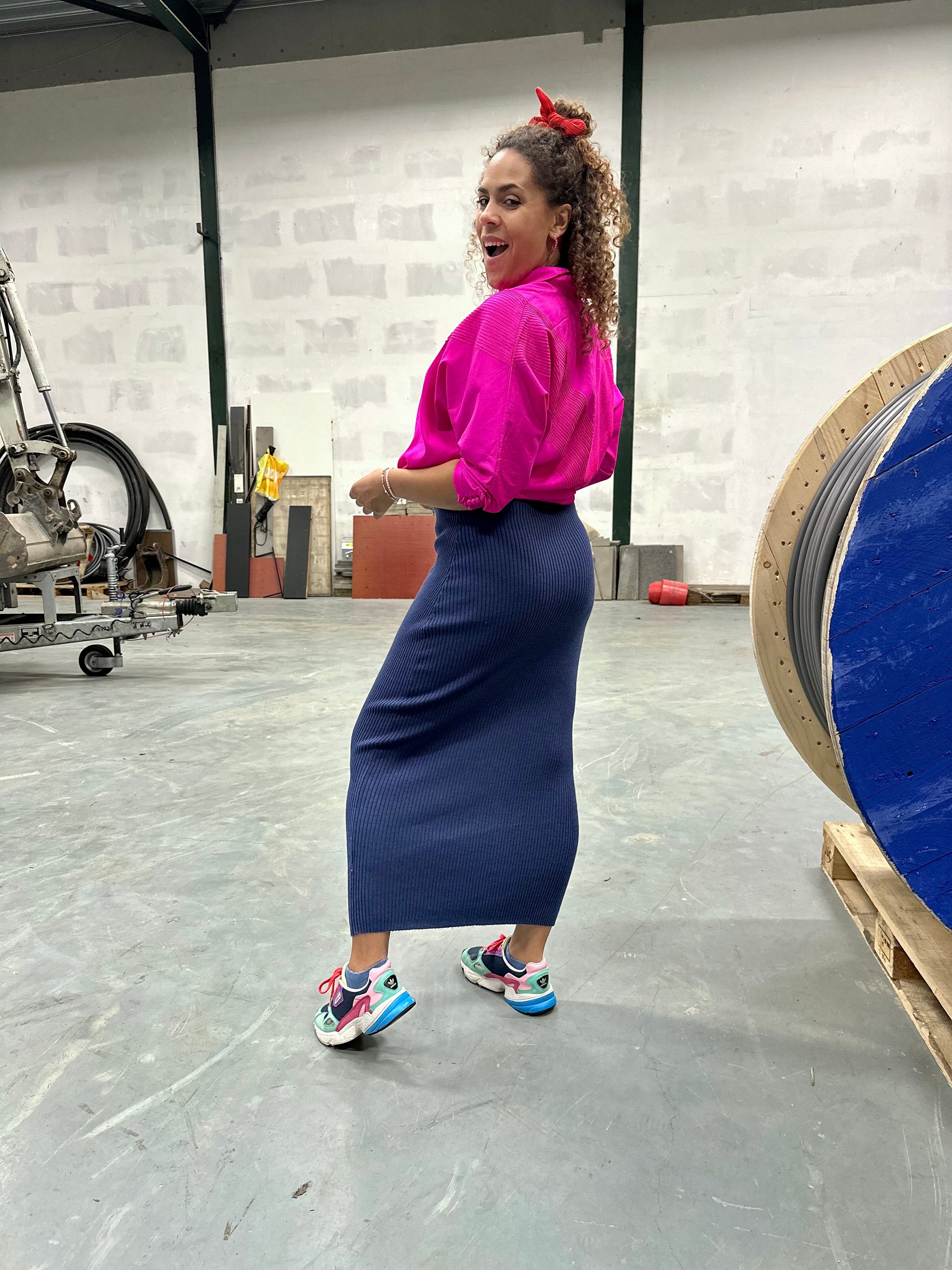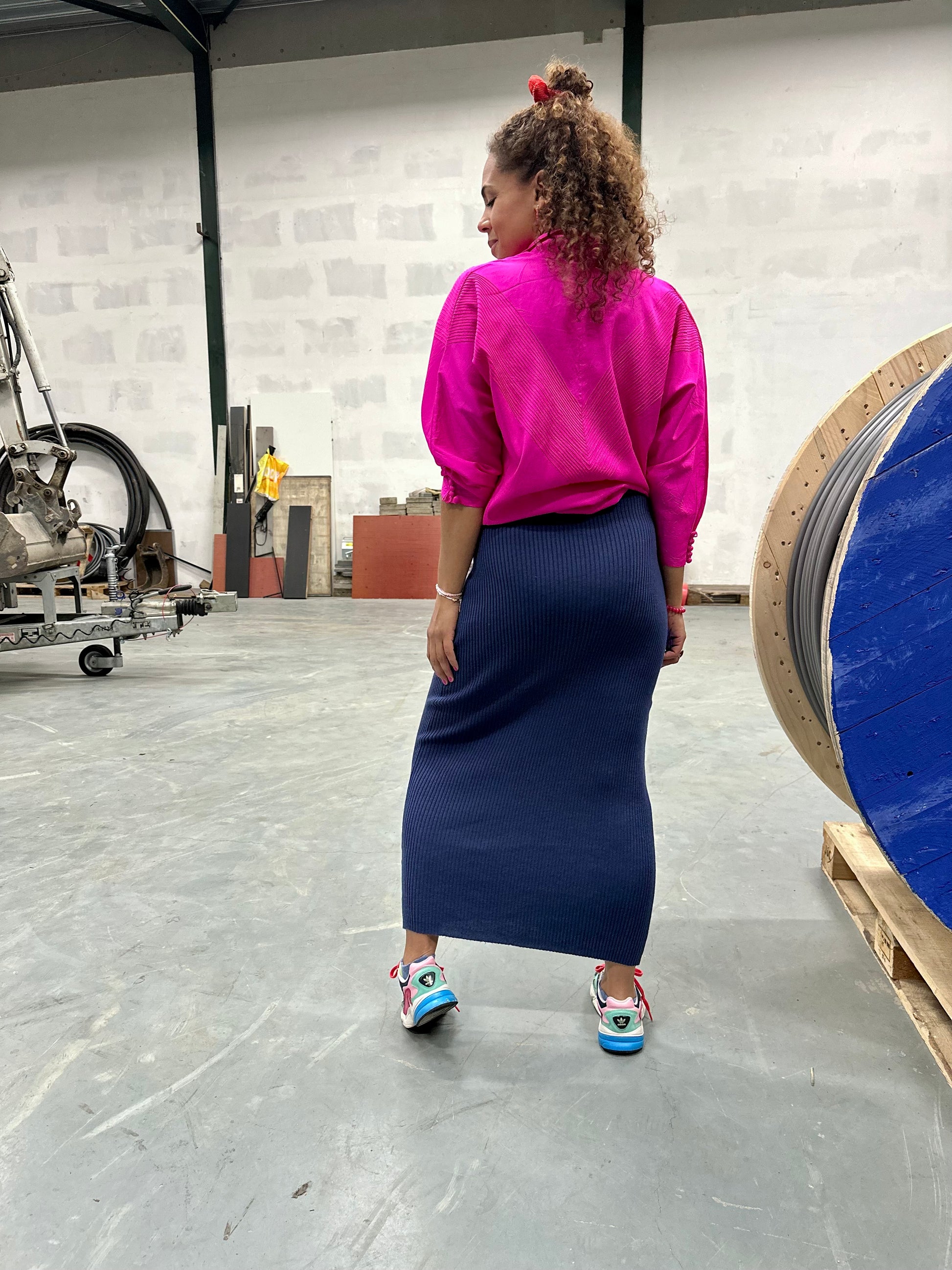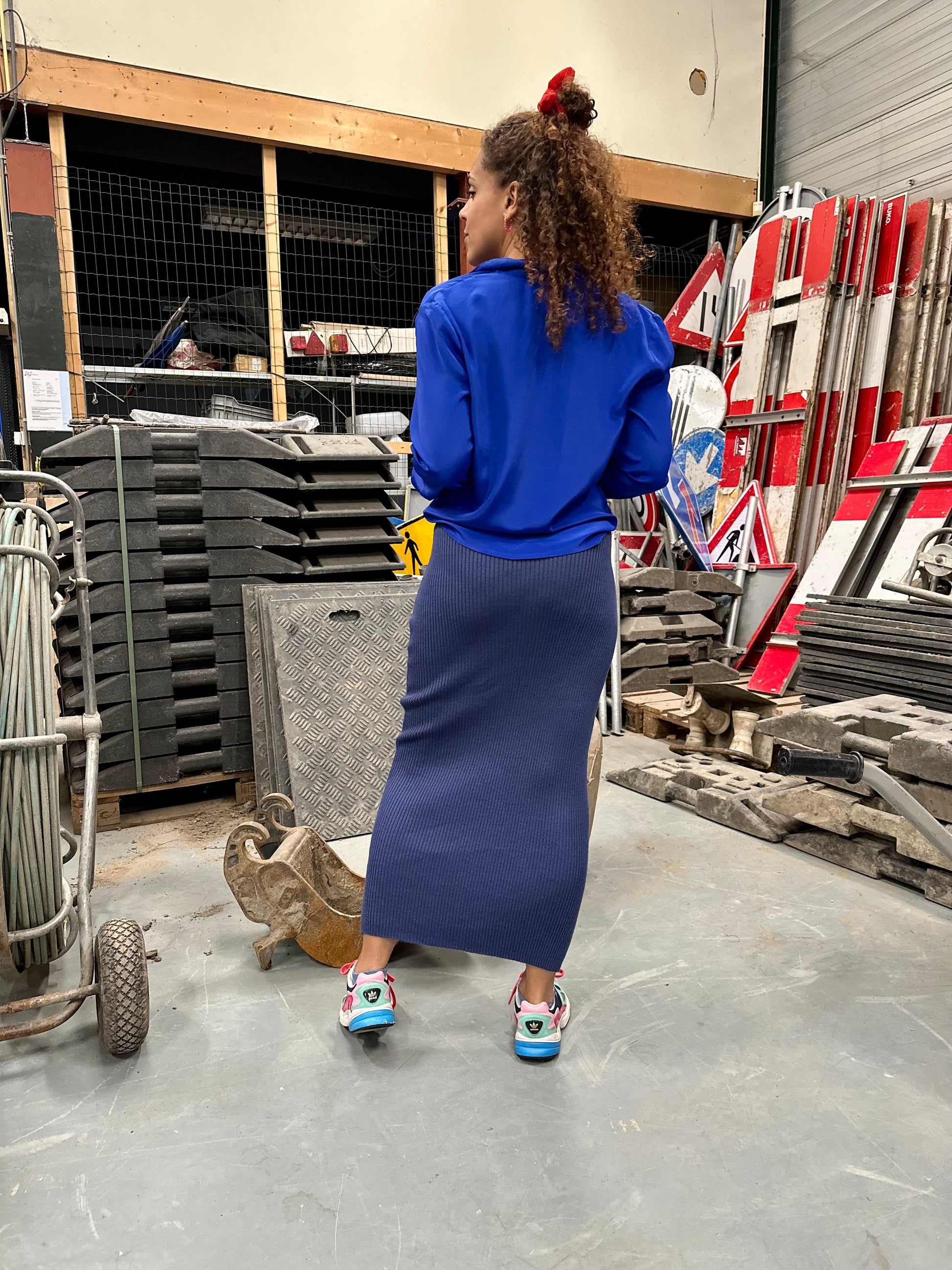 Prachtige en lange gebreide rok van merinowol in mooi donkerblauw. De gebreide stof zit aansluitend om je lichaam heen en geeft ultiem comfort. Alsof je in je joggingbroek loopt.