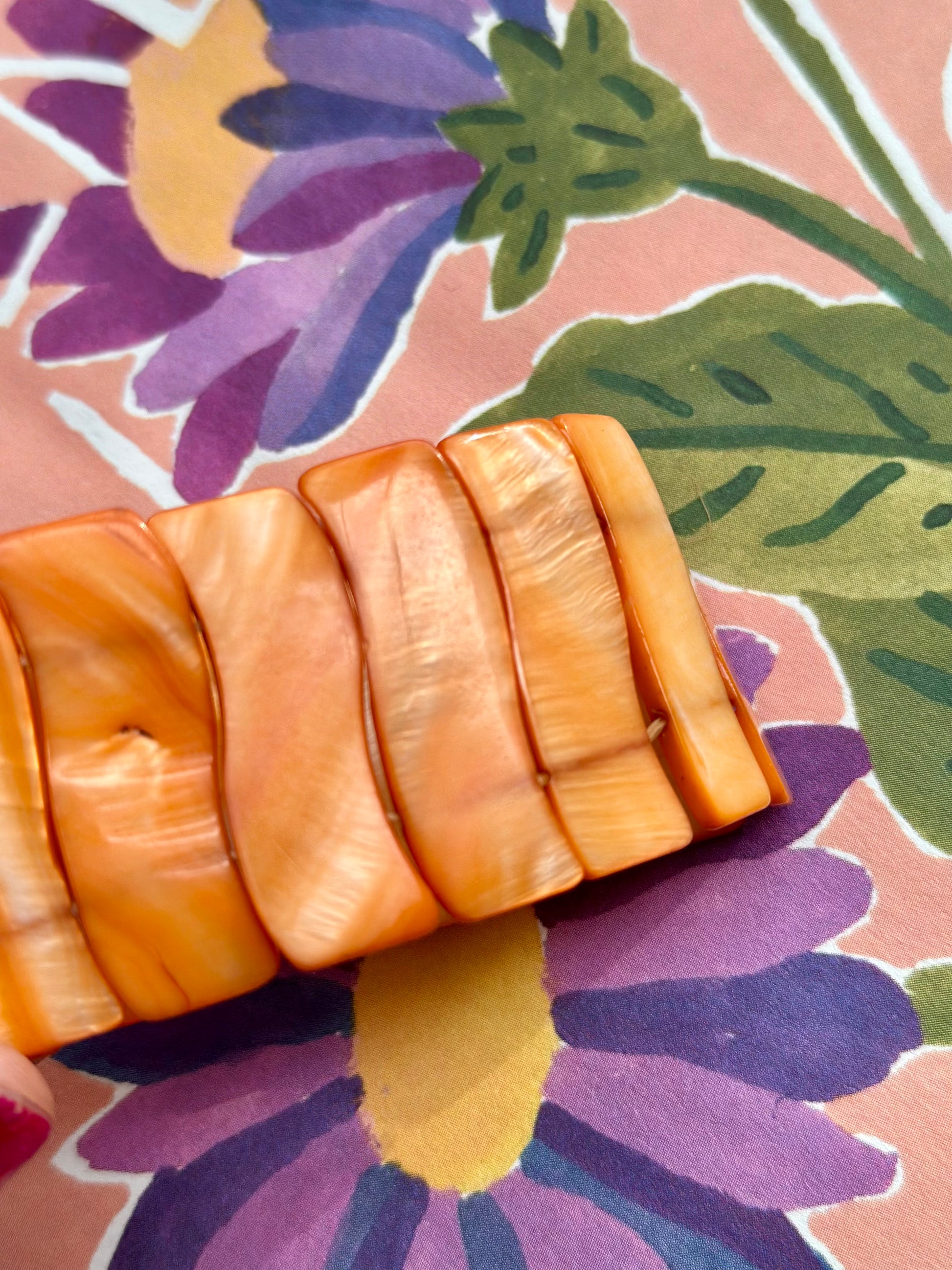Knaloranje armband gemaakt van schelpen, met een prachtige parelmoer glans. De schelpen zijn aan elkaar geregen middels een elastieken band.