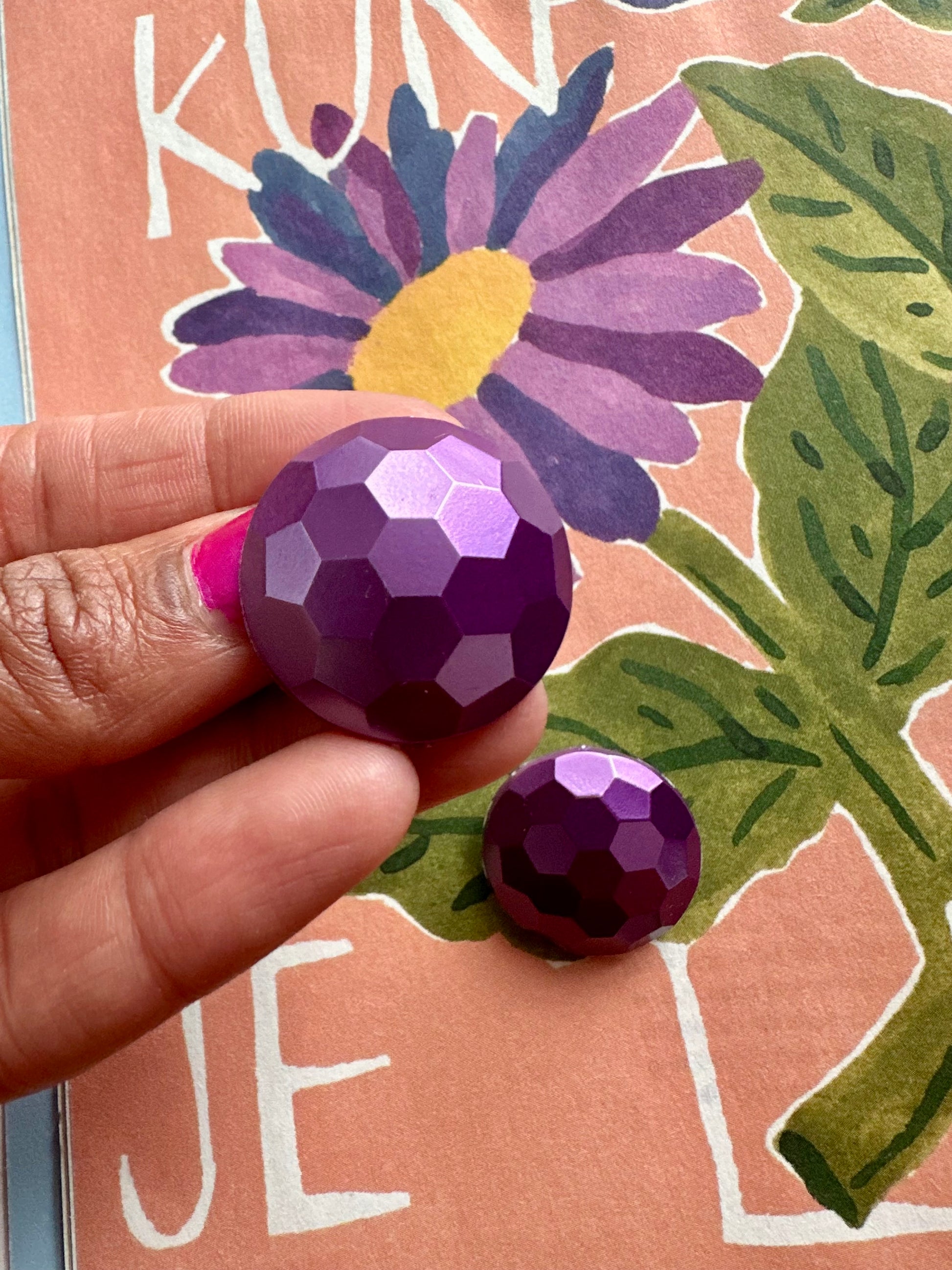 Ronde paarse clip-oorbellen, facetgeslepen dus lekker glinsterend.