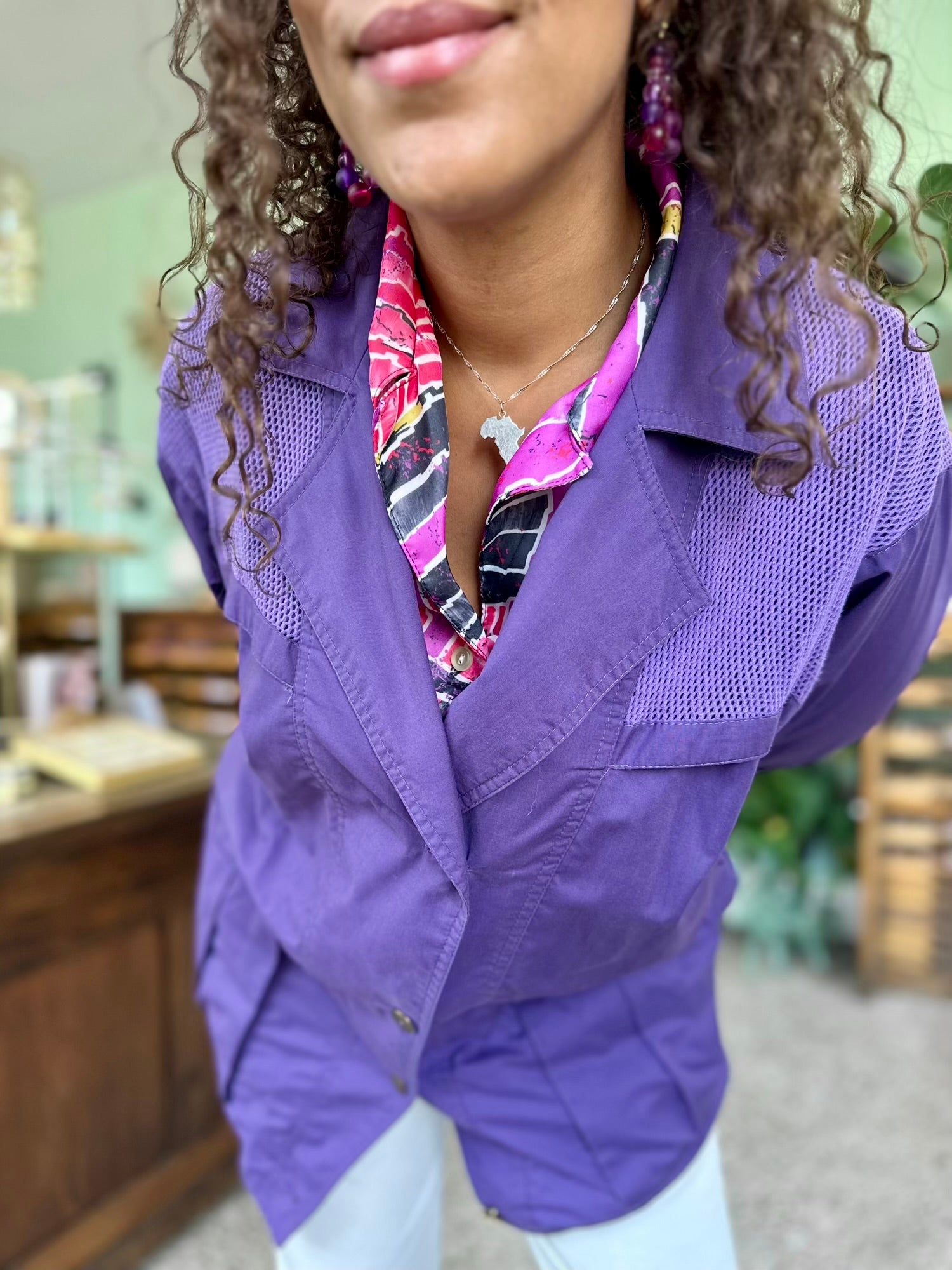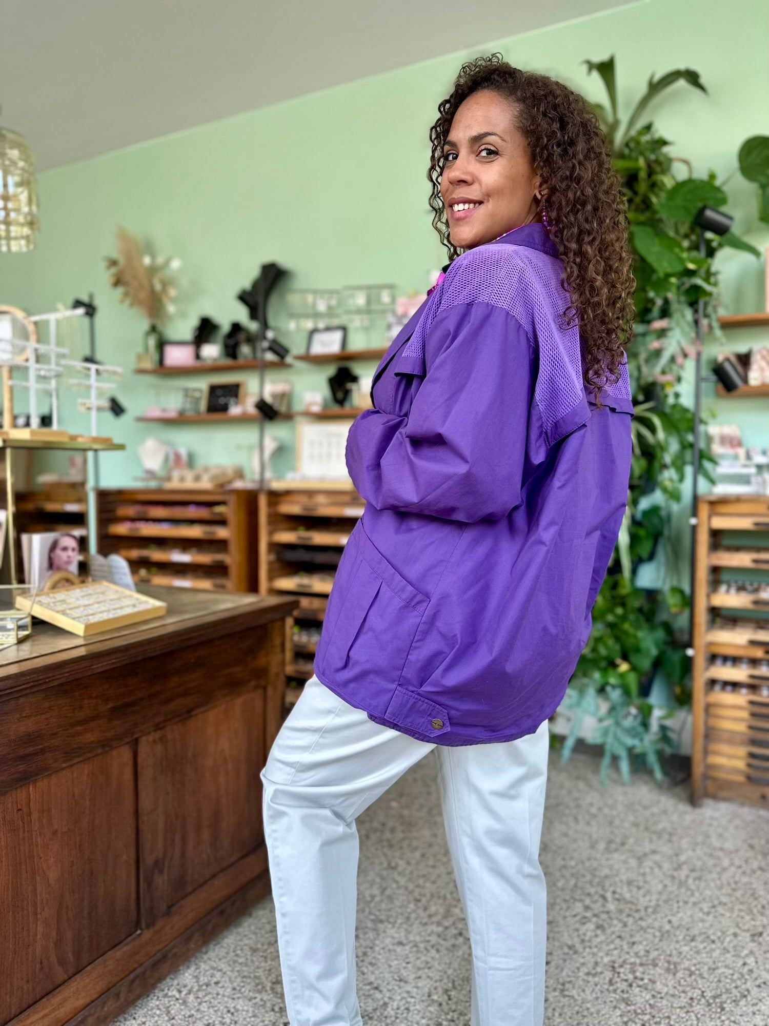 Een licht en luchtig jack dat meteen karakter toevoegt aan je look. De diepe paarse kleur, klepzakken en kraag maken dit tot een uniek statementstuk uit de jaren tachtig. Perfect als tussenjas voor frisse dagen.