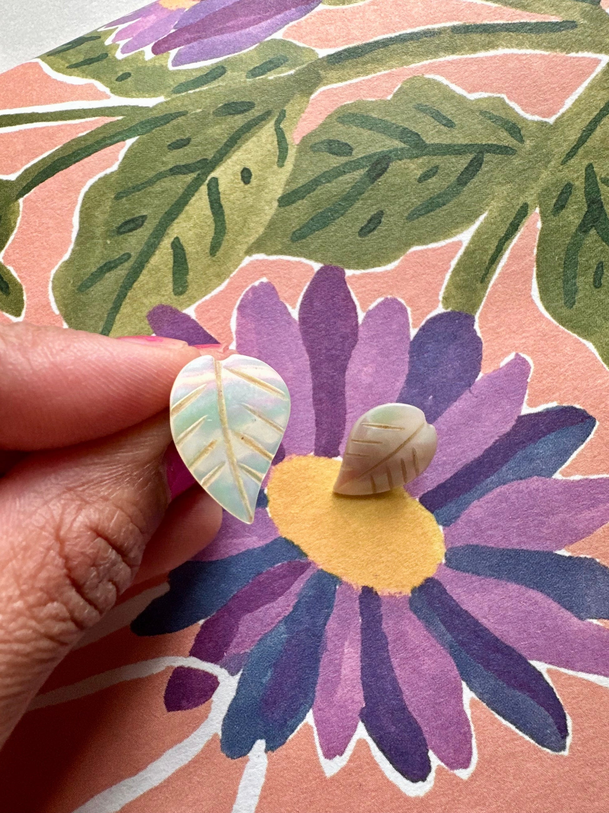 Prachtige kleine kunstwerkjes, clip-oorbellen in de vorm van een blad gemaakt van schelp. Echte juweeltjes, doe mee glanzen in het daglicht.