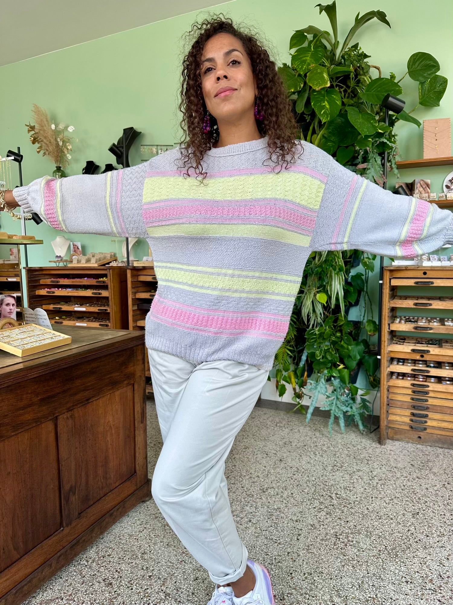 Deze vintage acryl sweater combineert pastelgroen, roze en geel op een lichtgrijze basis. Het resultaat: een speels en toch subtiel effect. Comfortabel warm zonder te zwaar, ideaal voor nazomer en vroege herfst.