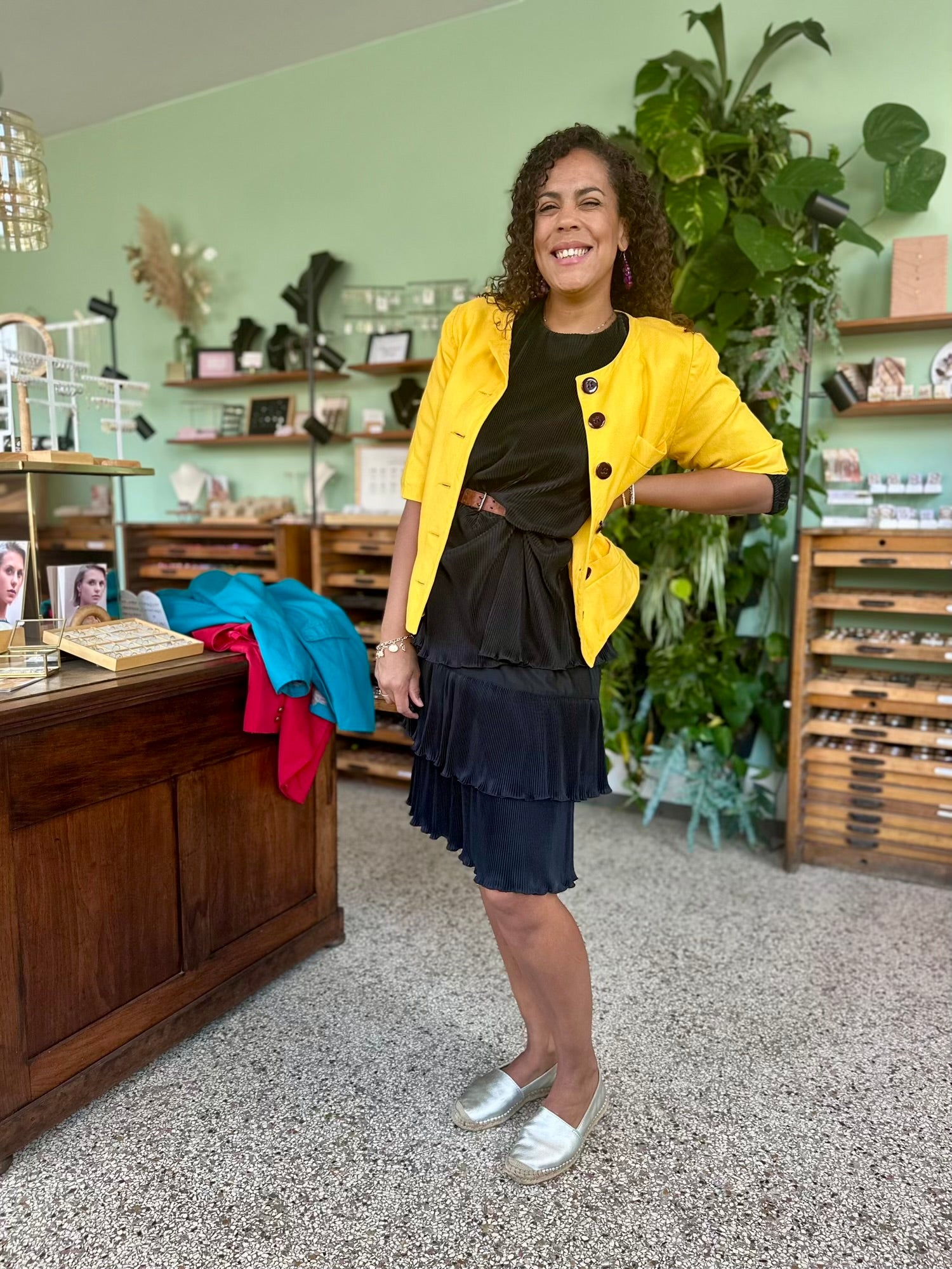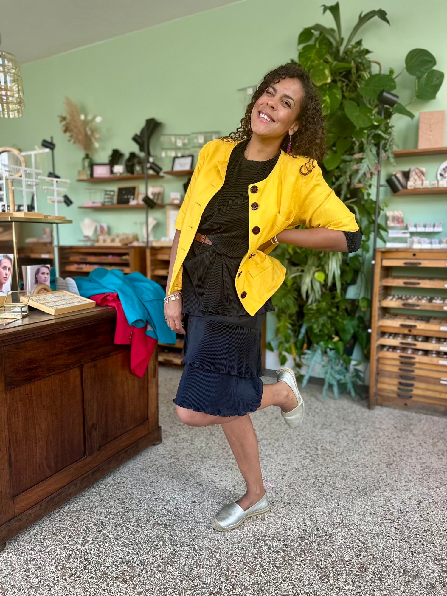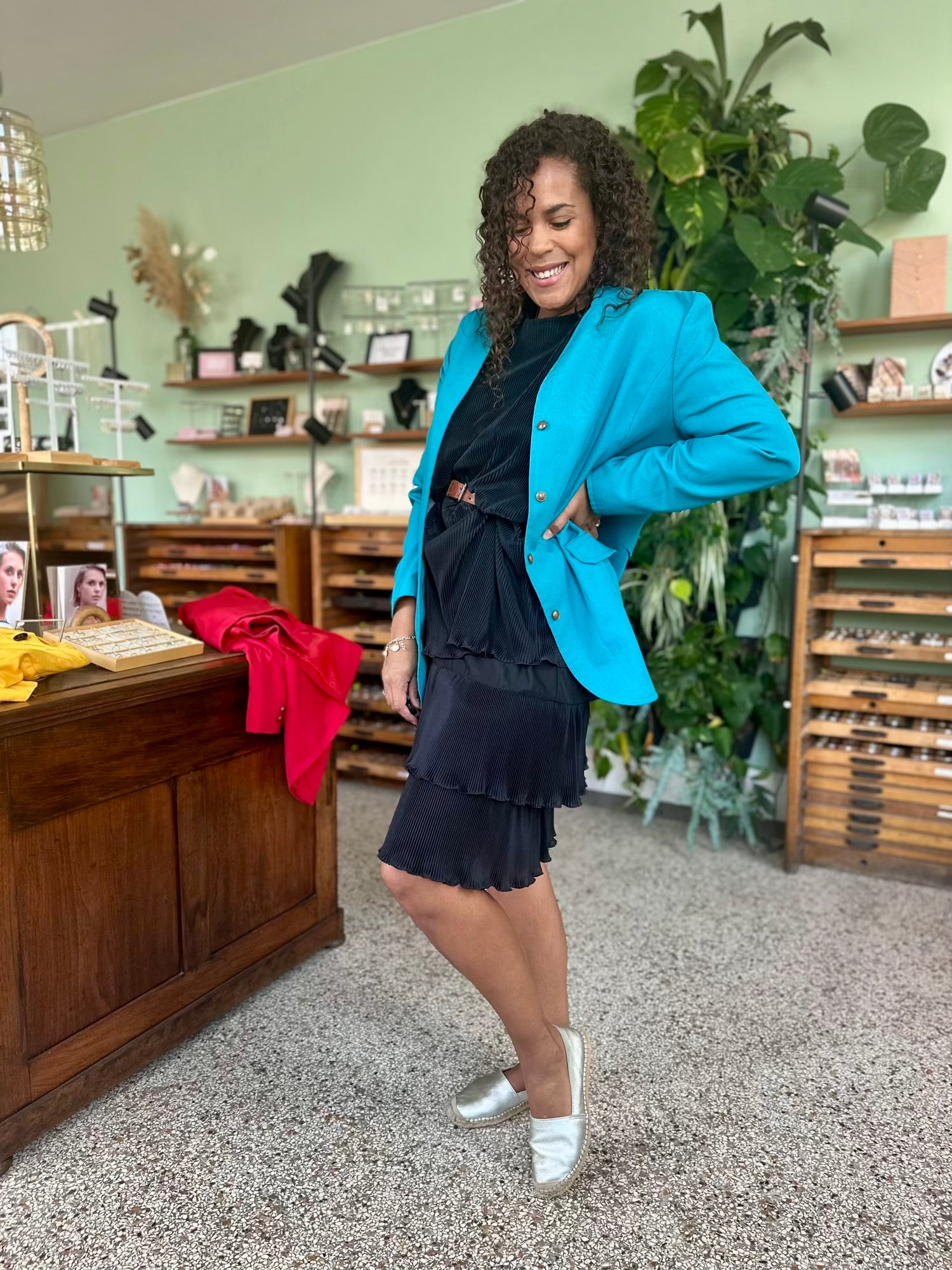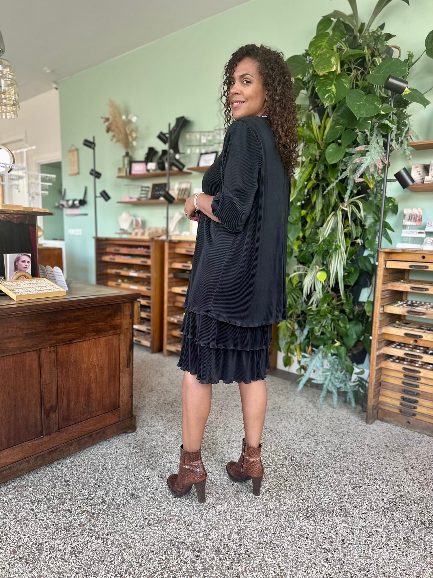Een jurk die beweging ademt. De lichte plooien en de verticale structuur in de stof zorgen voor een slank en zwierig effect. Een prachtig klassiek exemplaar dat zowel feestelijk als stijlvol casual gedragen kan worden.