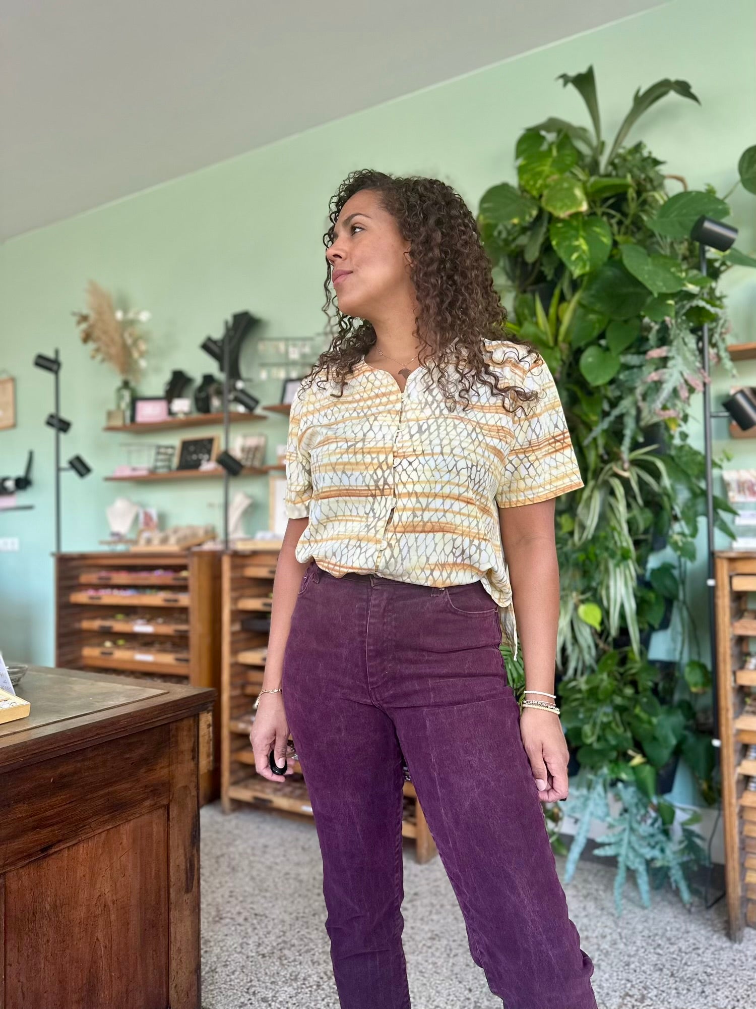 Dit blousje voelt in eerste instantie als fijne basic maar heeft toch de luxe glans van goud. De subtiele slangenprint maakt het speels en toch stijlvol. Een echte statement-top die zowel zakelijk als feestelijk kan worden gedragen.
